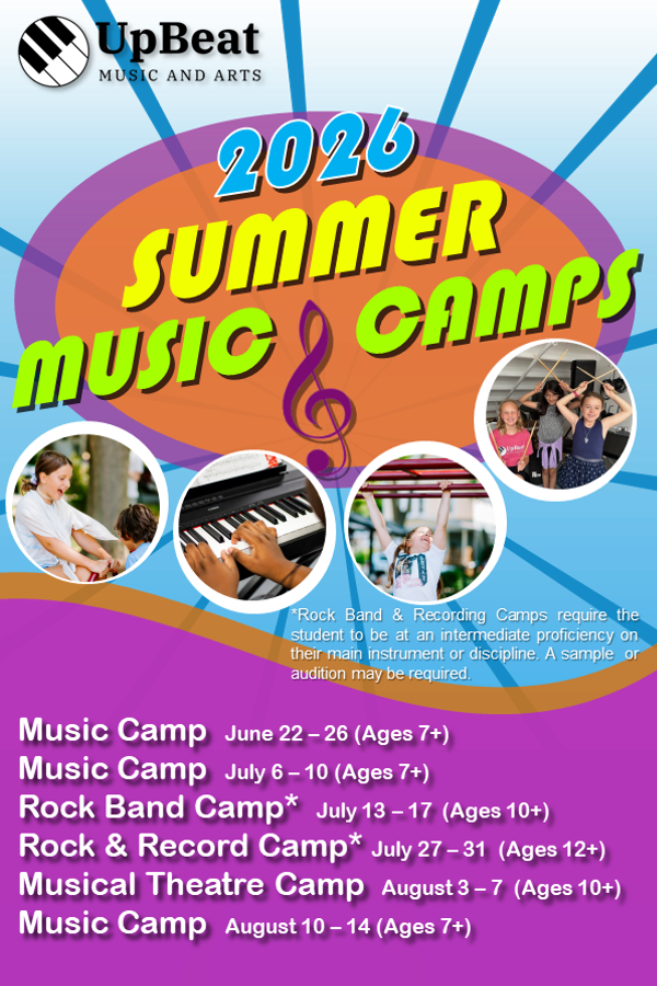* Please note, the UpBeat Rock Band Camp is for students who are already at an intermediate proficiency level when singing or playing guitar, piano, bass or drums. An audition or sample may be required for Rock Band Camp.